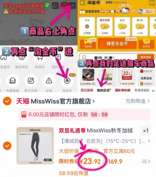 在售价169.9元,领45元券+12.98元礼金,商品页弹随机红包(亲测6元),商品页右上角三个点点进去-底部淘金币点进去-淘金币 我的足迹页拍,叠淘金币+凑单1件,折主商品低至23元;