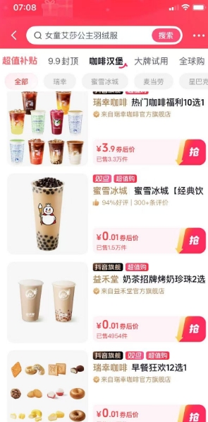 抖音app-商城-超直购-天天领福力-领奍包-去使用看看有无0.01元,超多饮品购