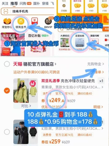 在售价619元,领105元券+79.02元礼金,商品页右上角三个点点进去-底部淘金币点进去-淘金币 我的足迹页加购,叠淘金币+2张券+凑单一起,折178元,骆驼雨神冲锋衣单,冲❗️