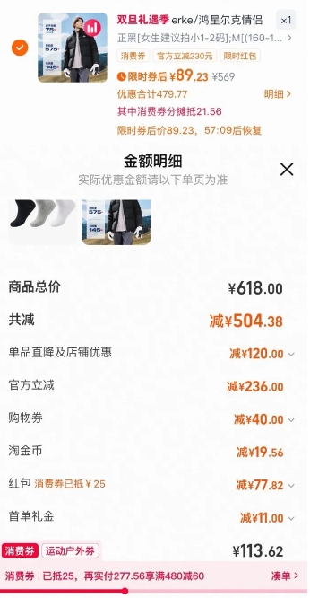在售价569元,领320元券+领44.82元礼金,去店铺首页 进店弹8元红包+如果还有11首单的话,主图右上角三个点-淘金帀,叠凑单一起,折主商品89.23元,没首单的话贵点~