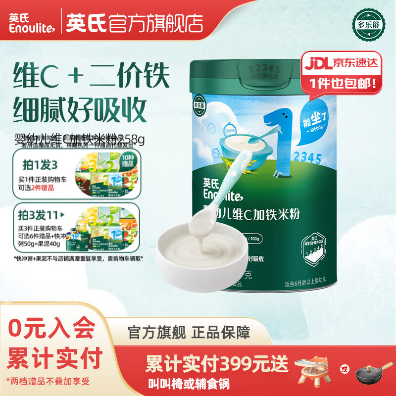 ¥64.6 英氏米粉罐装套组婴幼儿高铁米粉6-12个月辅食宝宝营养米糊 1阶6月+第一口选维C加铁 258g*1罐 66