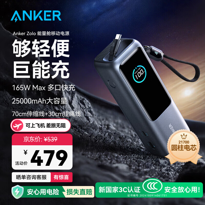 ¥239.5 ANKER安克能量舱【新3C认证可上飞机】移动电源25000毫安自带双线伸缩线165W大功率充电宝快充苹果17 【充电宝锖色】25000mAh|自带双线|智能屏显 479