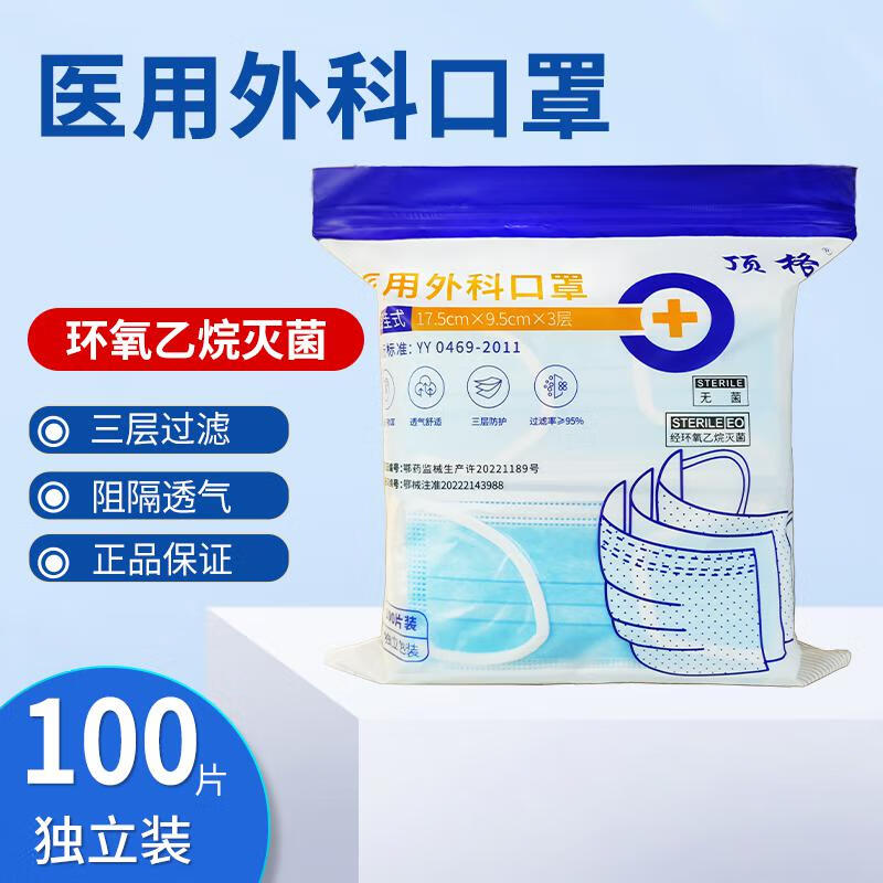 ¥13.8 顶格一次性医用外科口罩独立装无菌级成人医用口罩三层透气亲肤不勒耳 蓝色 成人款【灭菌级100只】袋装 17.8