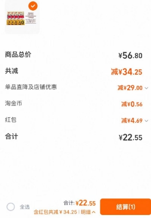 在售价56.8元,领29元券,先收藏-签到红包(领随机红包,领取直达,亲测4.69元)-在签到页面找到该商品即可抵扣,实付低至22.55元包邮;