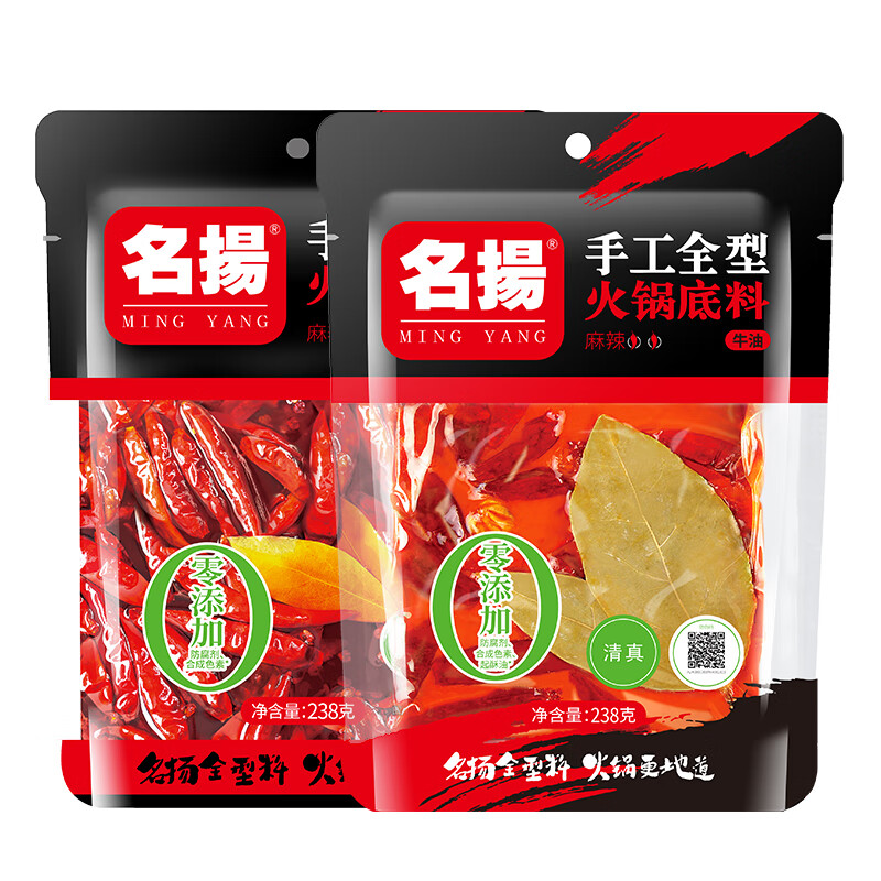 ¥39.8 名揚名扬火锅底料牛油麻辣238g/200g麻辣香锅串串调味料家用宿舍四川 牛麻238g*1+清油238g*1 45.8