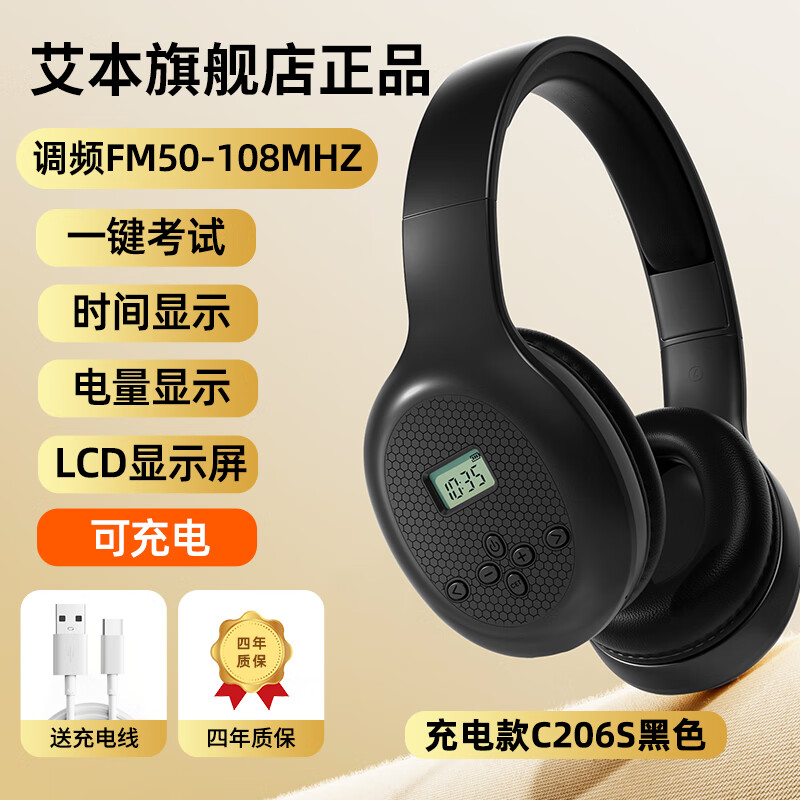 ¥36.97 艾本(AIBEN)【 信号强全包耳不漏音】英语四六级听力耳机头戴式考试蓝牙无线耳机调频FM大学4级6级考试耳机 充电款黑色【全包耳+带时间+电量显示】Type-c充电 套餐一(耳机+带麦线) 43.42