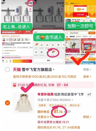 在售价609元,领160元券+21.9元礼金,商品页右上角三个点点进去-底部淘金币点进去-淘金币 我的足迹页加购1件,叠淘金币+凑单2款+消费券+服饰券+店铺限时弹大额27元红包,折主商品81元到手,Bug先锁‼️‼️现在去大概率都弹