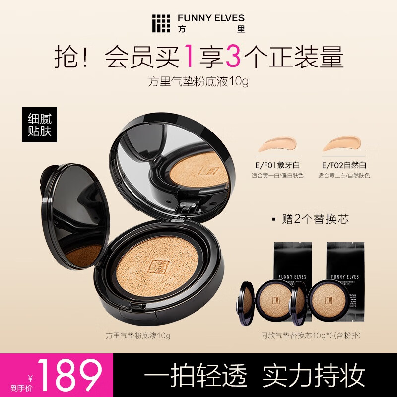 ¥89 方里(FUNNY ELVES)气垫粉底液 定妆补妆粉底液持久不脱妆 干皮象牙白 10g E01 189