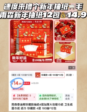 在售价19.99元,叠5元券,实付19.9元包邮,速度来lū个新年抽纸;