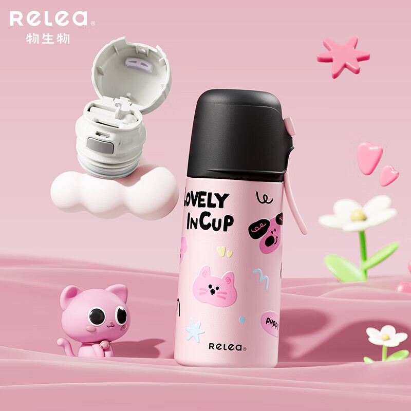 ¥39.9 物生物(RELEA)儿童保温杯女生高颜值316L不锈钢吸管杯小学生上学专用带杯盖水杯 甜巧麻薯-镜面316L内胆380ml 59.9