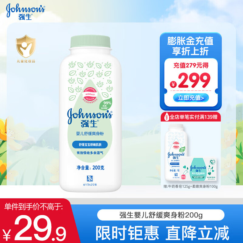 ¥24.45 强生婴儿爽身粉新生儿儿童宝宝屁屁痱子吸汗舒缓柔嫩玉米粉干爽 舒缓爽身粉200g 24.7