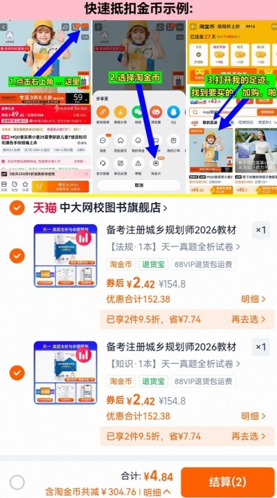 排查154.8元选项,领140元券(反复领2次券),商品页右上角三个点点进去-底部淘金币点进去-淘金币 我的足迹页加购2件,叠淘金币,实付4.8元包邮;