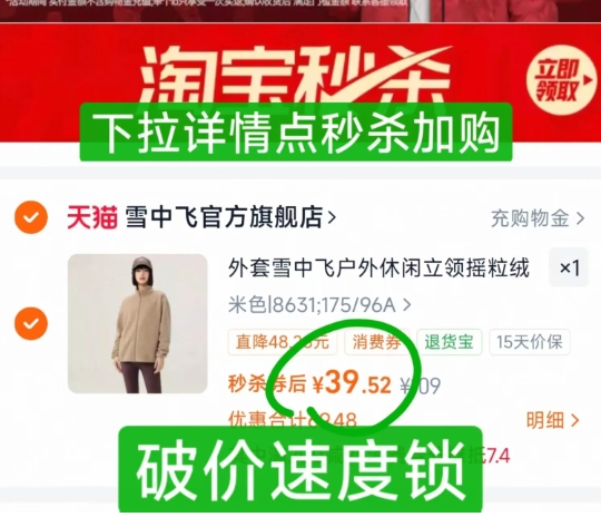 在售价409元,领340元券+13.8元礼金,商品页价格下拉详情页-淘宝秒杀点进去加购,叠凑单一起,折主商品39.5元;