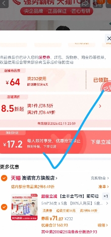 第一个选项232元,叠8.5折+价格下方限时补贴17.2元+消费券, 叠凑单一起加购物车付款,折主商品71元,鈣锌同补,官旗放心入;