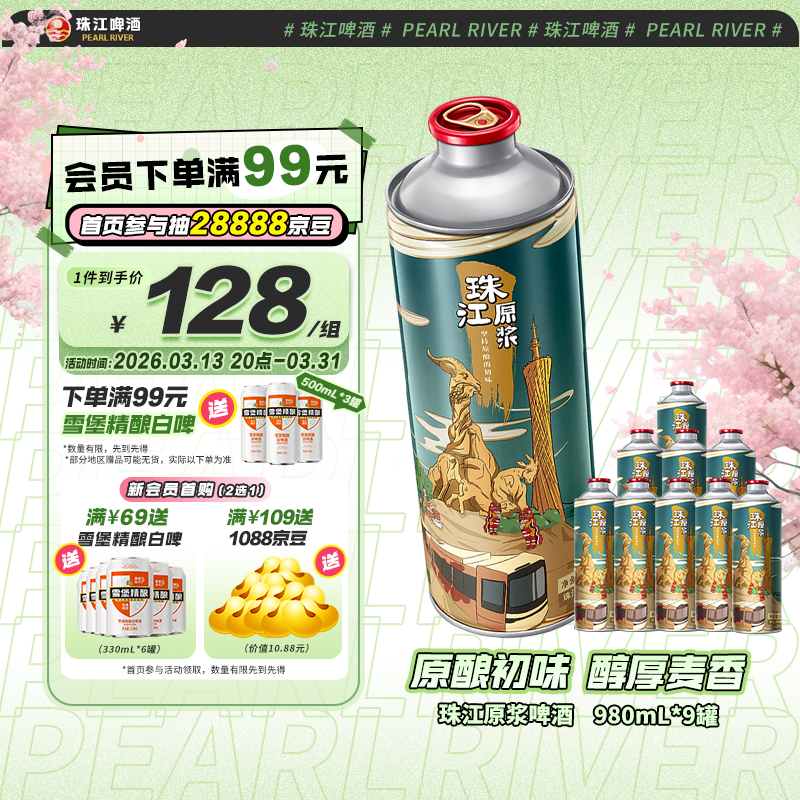 珠江啤酒11度原浆980ml*9罐,叠加黑五200-20补贴券到手仅需115.2元(赠白啤3罐)