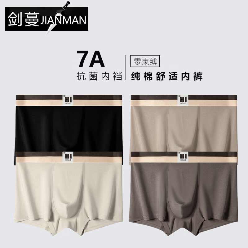 ¥29.9 剑蔓男士内裤男平角裤中腰四季运动大码四角青年学生潮流短裤衩男生 95%棉系列【总裁款】【4条装】混色 XL 建议100-120斤 59.9