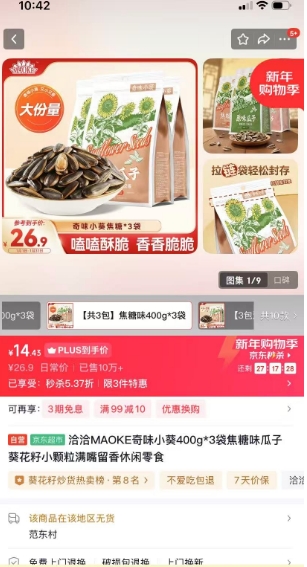 秒杀+plus14.4元包邮洽洽瓜子400g*3