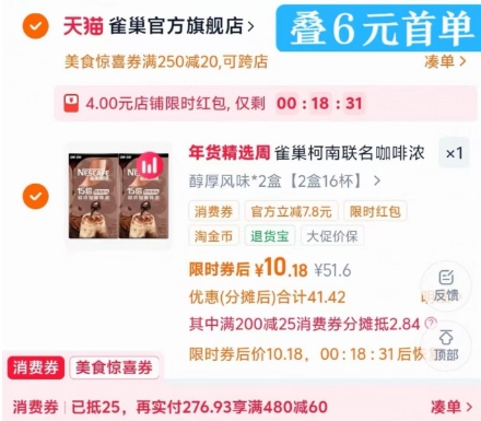 在售价51.6元,领12元券,商品页右上角三个点点进去-底部淘金币点进去-淘金币 我的足迹页加购51.6元选项,叠淘金币+凑单2款+消费券+美食券,折主商品10.12元,贈品是8杯 現量 随时无‼️‼️