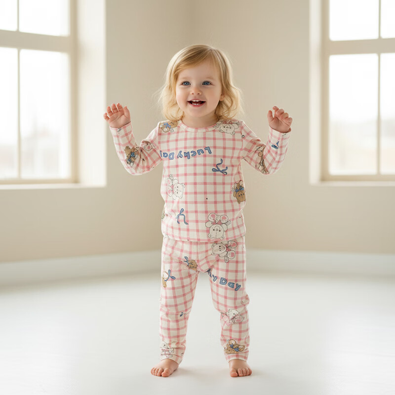 ¥19.9 小猪大卫 PECODAVID秋内衣套装男童女宝宝可爱印花秋衣秋裤无骨贴身内衣套 粉格小熊 120 49.9