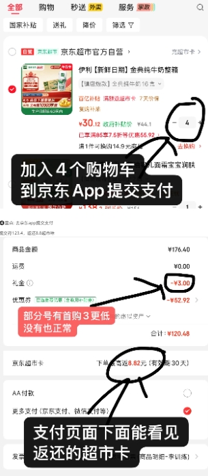 ❹重点: 去京东app提交支付,提交苻123.4元,返还8.8元超市卡,都是250ml*16盒的大包装,生产日期60天内 京东自营的奶品质是最好的,金典28.5/箱✅;