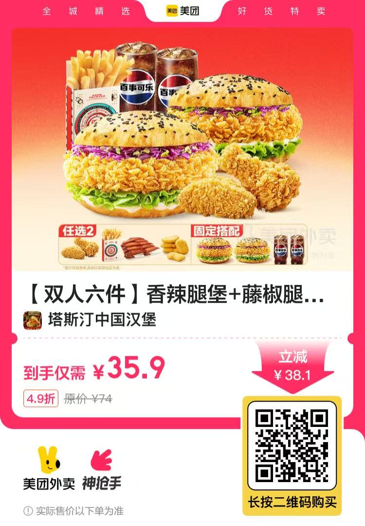 【美团外卖】35.9元!塔斯汀中国汉堡 双人六件套餐