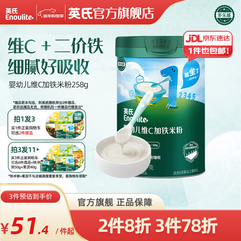 ¥64.6 英氏米粉罐装套组婴幼儿高铁米粉6-12个月辅食宝宝营养米糊 1阶6月+第一口选维C加铁 258g*1罐 66