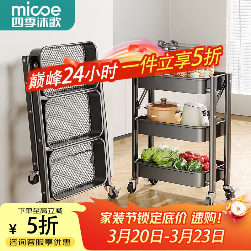 四季沐歌厨房置物架3层耀黑款,到手价仅需38.38元