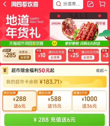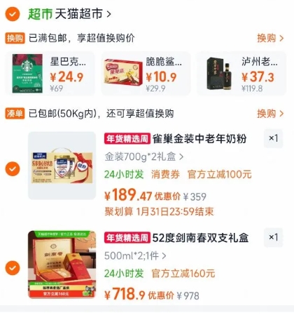 活动售价978元,领取淘礼金1元+20元优惠券,参与立减160元,猫超首页超级补贴频道领取999-100元红包并加购商品,猫超首页搜索剑南春领取10元品牌金(结算时猫超卡形式抵扣),猫超首页搜索周四吾欢喜点进去就充值超市卡送15元,加凑单品下单1件,实付低至718.9-15-10(品牌金)=693.9元。注:主商品和凑单品都需要在超级补贴频道加购红包才可以使用,这款凑单品可以商品页下拉点超级补贴进去加购就可以!