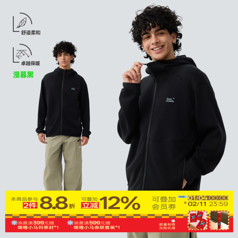 ¥379 warmtreesTreesOutside羊毛莱赛尔混纺针织连帽夹克秋冬季时尚外套运动上衣 漫暮黑 L 399