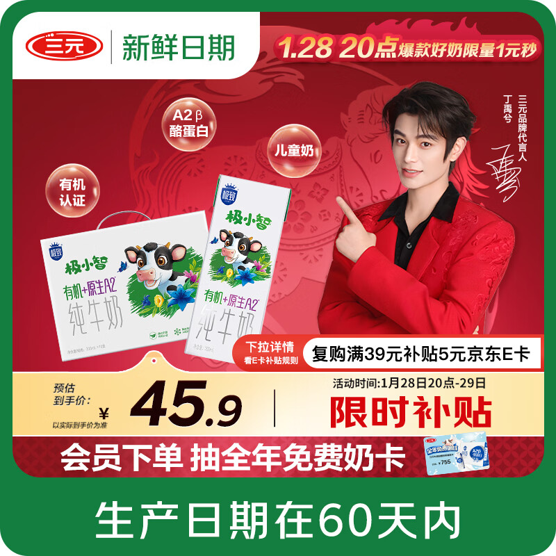 三元极致A2β-酪蛋白纯牛奶200ml*10盒折后37.5元/箱