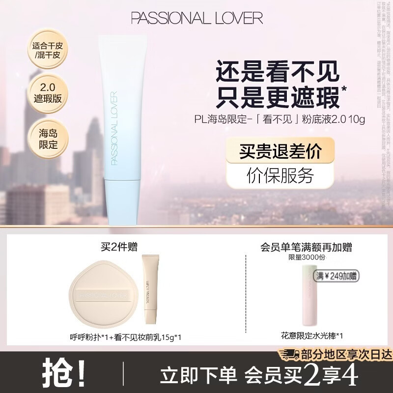 ¥49 恋火PL看不见粉底液2.0/1.0 奶油肌干皮持久不脱妆粉底生日礼物送女生 [海岛限定]看不见粉底液2.0-10g 01象牙白 69