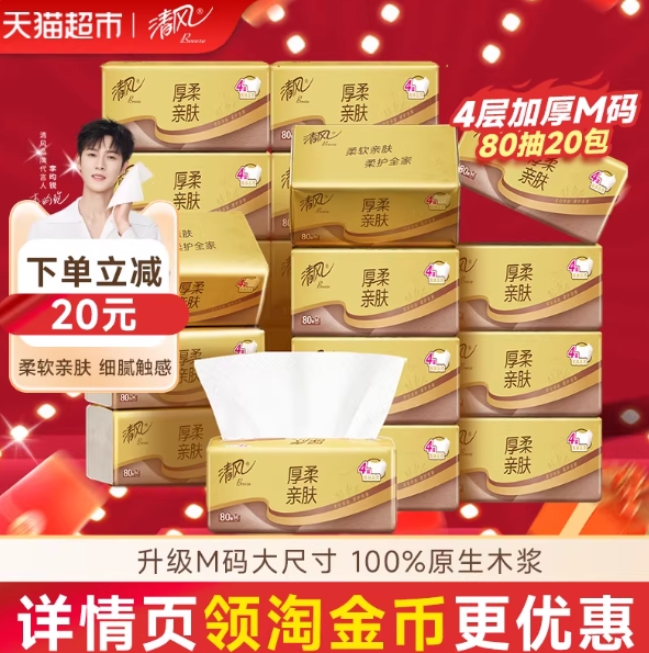 17.6元包邮!清风抽纸金装M 4层20包