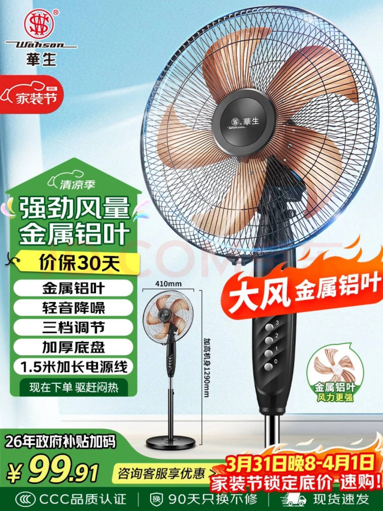 华生16英寸落地扇到手价仅63元