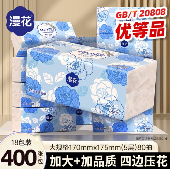 26.9元包邮!漫花.雪茶花抽纸 80抽*18大包