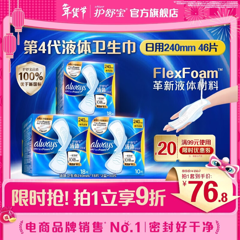护舒宝进口液体卫生巾日用组合46片 到手66.75元