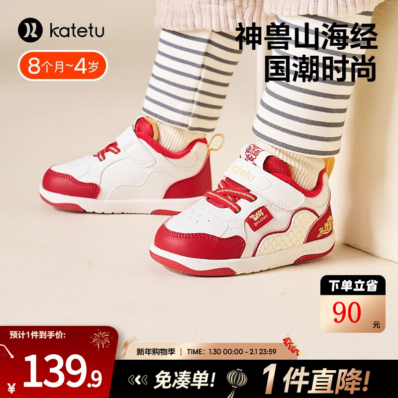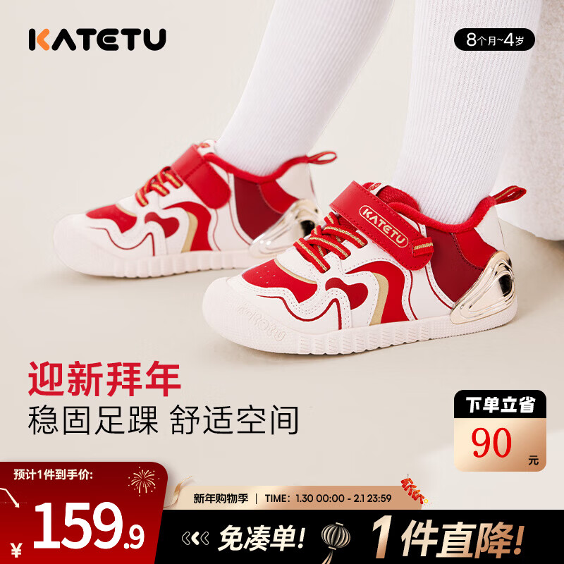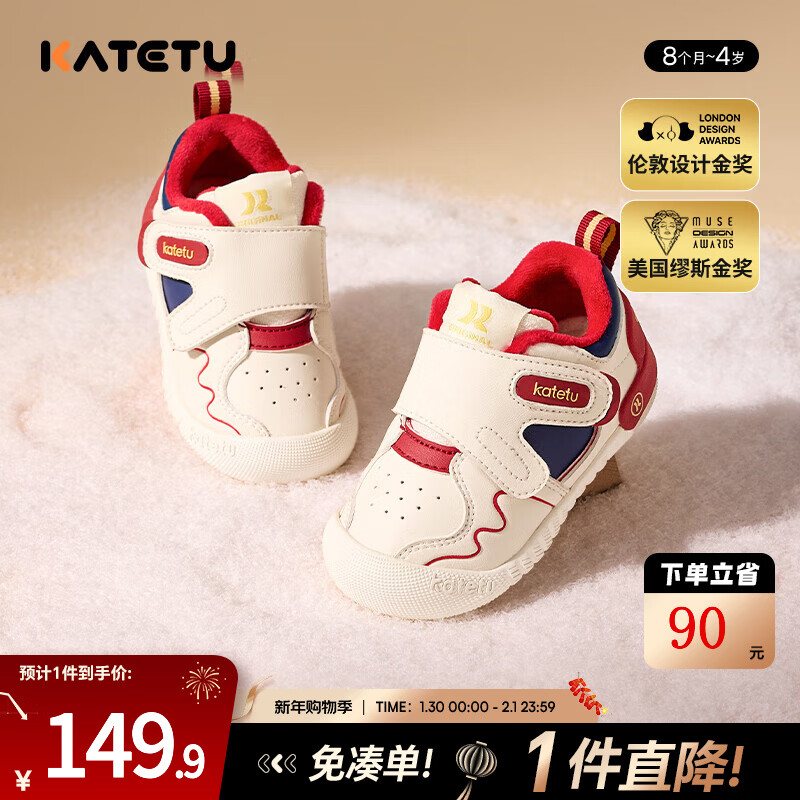¥219.9 卡特兔儿童学步鞋秋冬新年红儿童机能鞋婴幼儿室内学步童鞋加绒棉鞋 红白金 25 内长15.5cm 脚长14.3-14.9 249.9