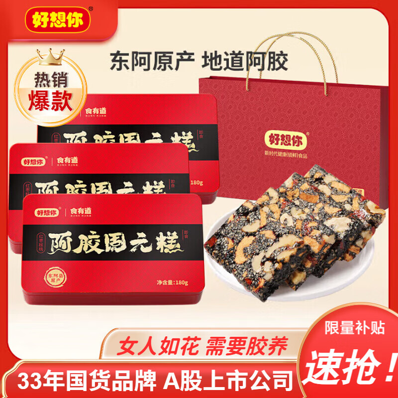 ¥59.9 好想你_报喜枣红枣核桃阿胶固元糕 礼盒成品三蒸三晒枣即食零食软糯香甜 阿胶固元糕180g*3【含手提袋】 99.9