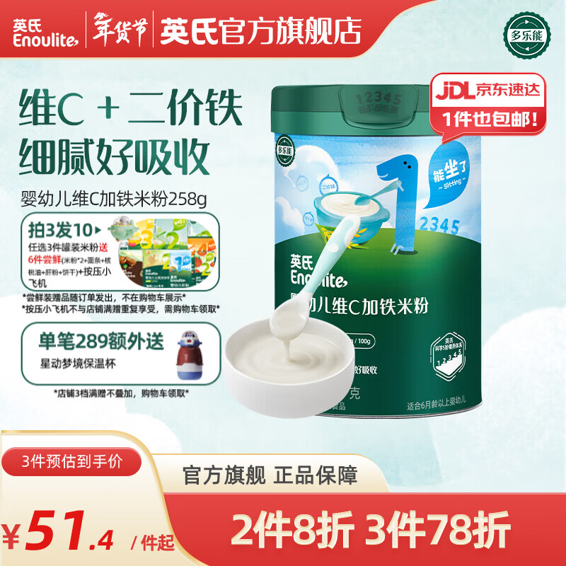 ¥64.6 英氏米粉罐装套组婴幼儿高铁米粉6-12个月辅食宝宝营养米糊 1阶6月+第一口选维C加铁 258g*1罐 66