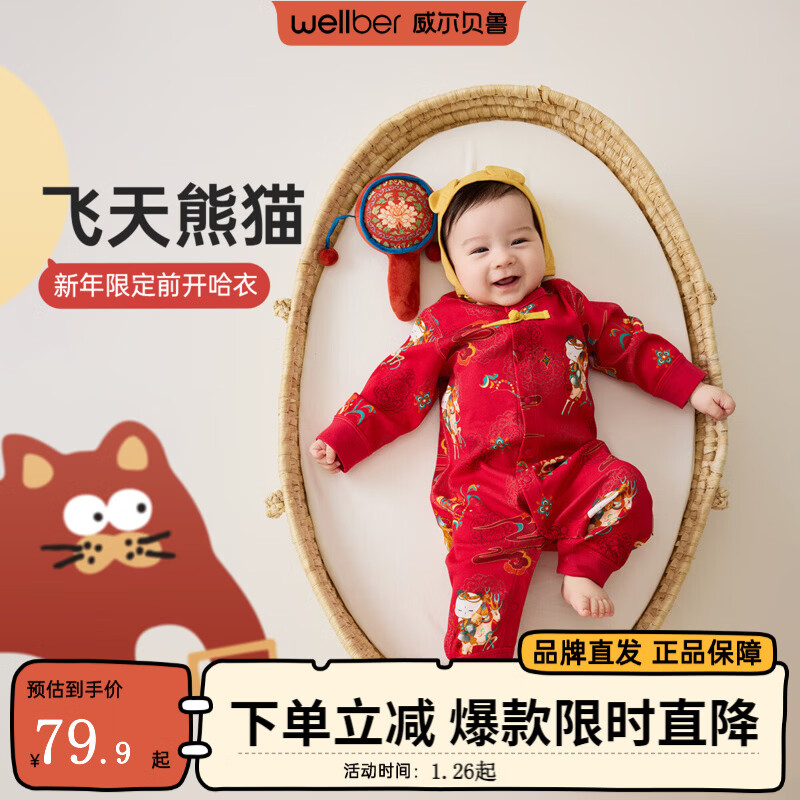 ¥49.9 威尔贝鲁(WELLBER)婴儿衣服夹棉哈衣秋冬款新生儿连体衣满月宝宝冬季过年拜年红棉服 【新年】棉毛布前开哈衣 90cm 89.9