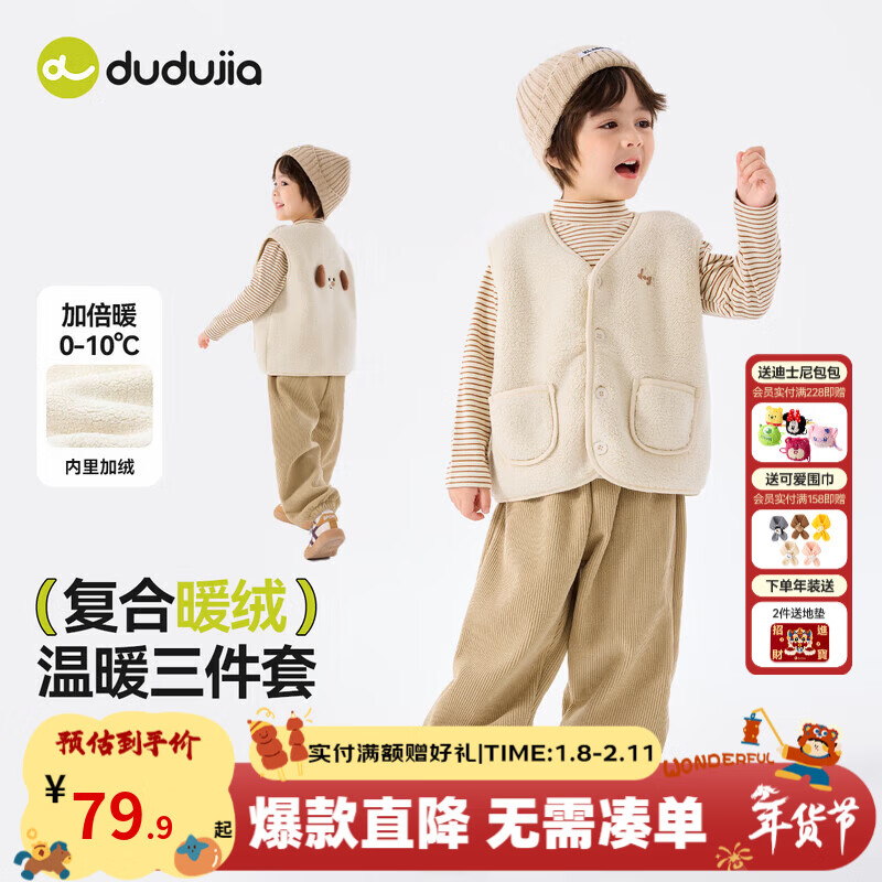 ¥82.8 嘟嘟家女童套装冬款女孩加绒背心上衣裤子冬装三件套卡通保暖童装加厚潮 米白色 100 90.8