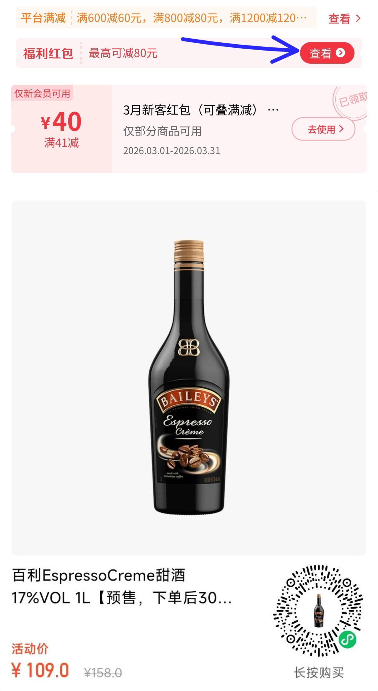 免税捡漏百利甜酒1L,最终到手价69元