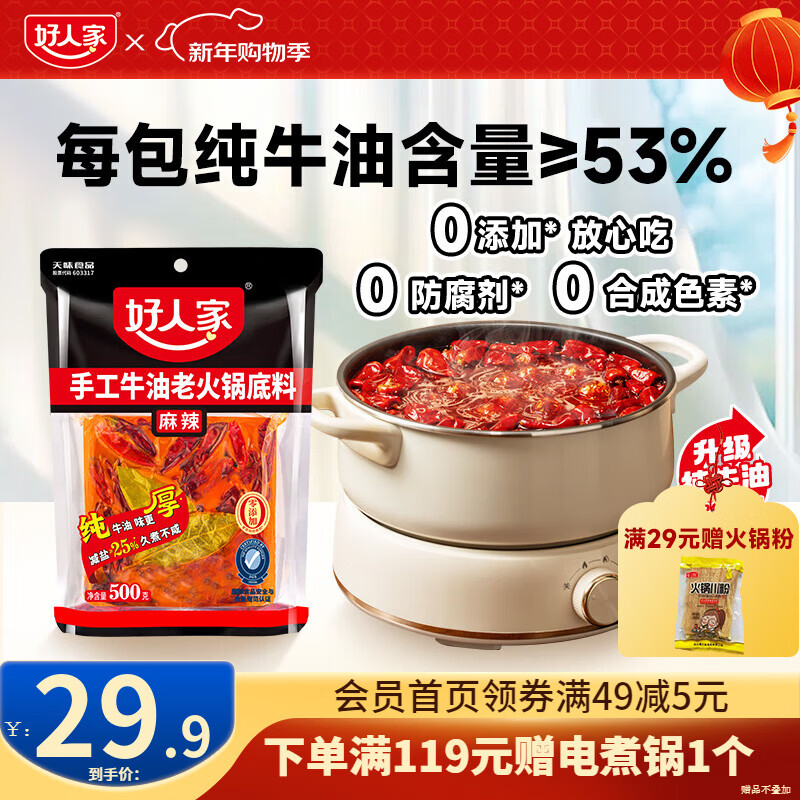 ¥23.9 好人家 手工火锅底料牛油升级四川麻辣 手工牛油火锅料500g【麻辣】 29.9