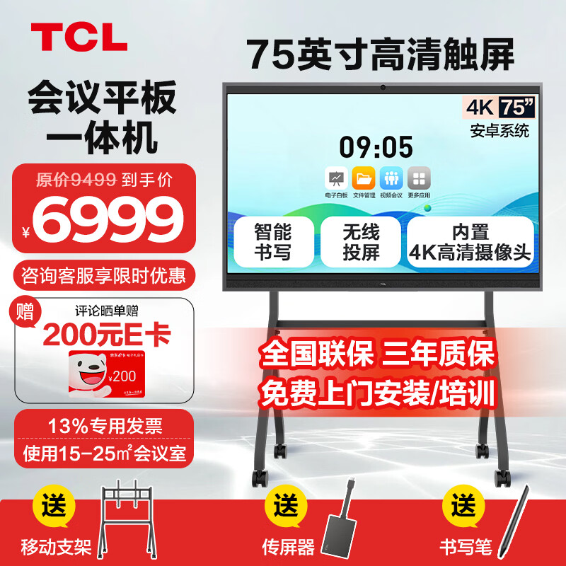 TCL会议平板一体机75英寸含支架传屏器,到手价6721.84元