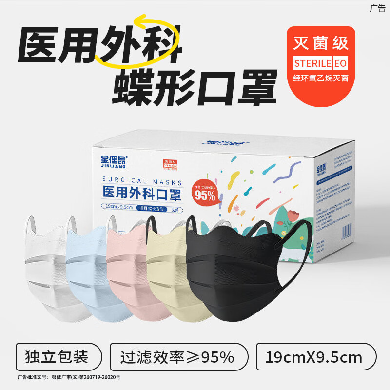 ¥25.9 金俚昂灭菌级医用外科口罩蝶形显脸小药监局注册正规国标加宽耳带不勒耳 5色平均【灭菌级—独立包装】50个 28.9