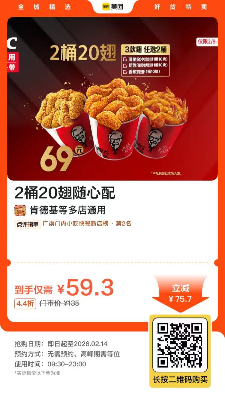 肯德基超值回归,2桶20翅随心配只要59.3元!