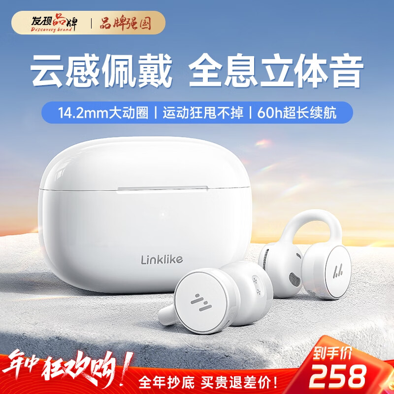 ¥89 Linklike【100%好评丨60H超长续航】蓝牙耳机耳夹式音乐榜前十无线运动耳机跑步不伤耳朵 60H超长续航丨云感佩戴 千元级配置+苹果华为安卓通用 258