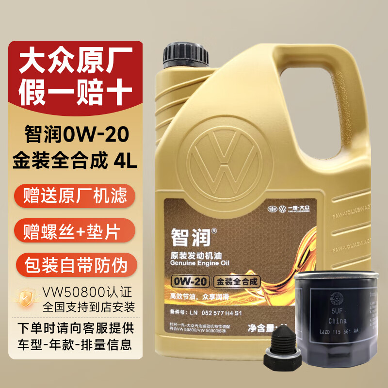 ¥348.65 大众(Volkswagen)一汽大众原厂机油智润全合成速腾宝来捷达VS5 vs7迈腾探岳 0W-20金装全合成 4L+原厂机滤 367