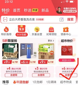 1、京东App-9.9包邮频道领取满15减6元优惠券: