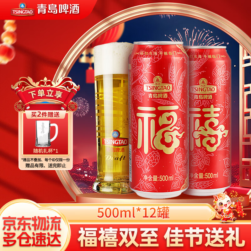 京东Plus会员专享!青岛啤酒福禧双至500mL*12罐 2件79.6元起 送玻璃扎杯礼袋