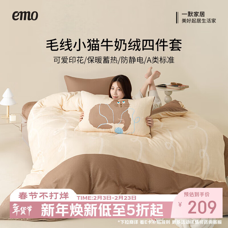 ¥137 一默四件套冬季保暖被套床单枕套居家床上用品毛线小猫牛奶绒四件套 毛线小猫牛奶绒四件套 团团棕 床单款 (被套150*200cm) 四件套 309